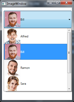 Width="275" Click="Button_Click"/>خط شماره 7، تمپلیت مرتبط با آیتمهای کامبوباکس را تعیین میکند، در اینجا یک استکپانل StackPanel به همراه دو المان Image(برای نمایش تصویر) و TextBlock(برای نمایش نام) قراردارد و از آنجایی که ItemTemplate یک کامبوباکس به ItemSource آن مرتبط است لذا باید دو فیلد empName و empImage در ItemSource موجودباشند. در نهایت کد زیر را درون کلاس ImageWindow وارد کنید: