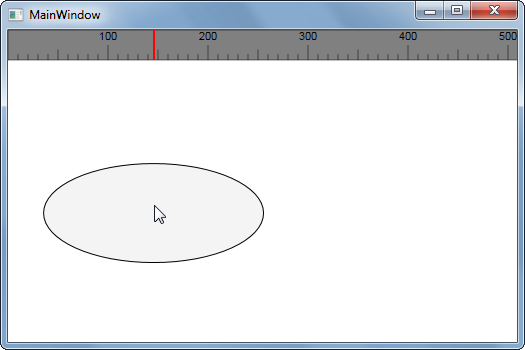 </Canvas>در کد بالا به کانواس نام mycanvas دادهایم و برای ویژگی Diagram خطکشمان آن را با استفاده از دستور Binding و ElementName به کانواس مرتبط کردهایم. برنامه را ذخیره کرده و با استفاده از ویژگی اسکیل مربوط به خطکش اسکیل کانواس و خطکشتان را تغییردهید. سپس با اجرای برنامه و حرکت دادن موس روی شکل بیضیگون نشانهگر را در خطکش خواهید دید(دقت کنید ایونت موسمووو فقط روی اشکال و اشیای درون کانواس کار میکند). اگر نیاز به خطکش عمودی دارید آن را به برنامه بیفزایید.